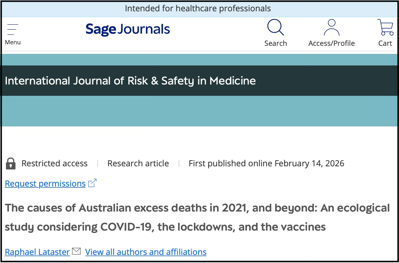 An article published by Sage, one of the top 5 academic publishers, has just been released, not just noting the curious phenomenon of excess mortality, and how it happens to correlate with the COVID-19 vaccination program, but pretty much proving that the jab is involved, by explaining that governments already admit to COVID-19 vaccine deaths, but also - and more satisfyingly - ruling out the typical alternative explanations of COVID-19 itself and the lockdowns, via an ecological study focused on 4 Australian regions. Source.